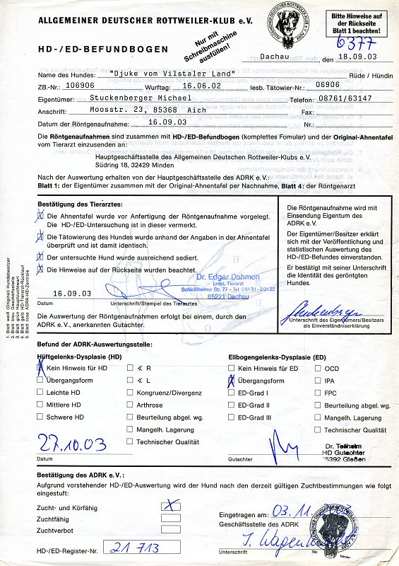 Groß, vorzüglich im Erscheinungsbild, aufmerksam, umgänglich. Kräftiger, typvoller Kopf, mittelgroße, gut getragene Ohren. Augenfarbe 2a, kräftiger Fang. Leftzen und Zahnleiste vorzüglich pigmentiert. Korrekt ausgeformte Brust. Pfoten sehr gut aufgeknöchelt. Harmonische Nacken-,u. Rückenlinie,leicht abfallende Kruppe. Kräftige, sehr gut gewinkelte Hinterhand. Korrektes Stockhaar, braune, klar abgrenzende Abzeichen. Rute hängend getragen. Flüssiger Bewegungsablauf.